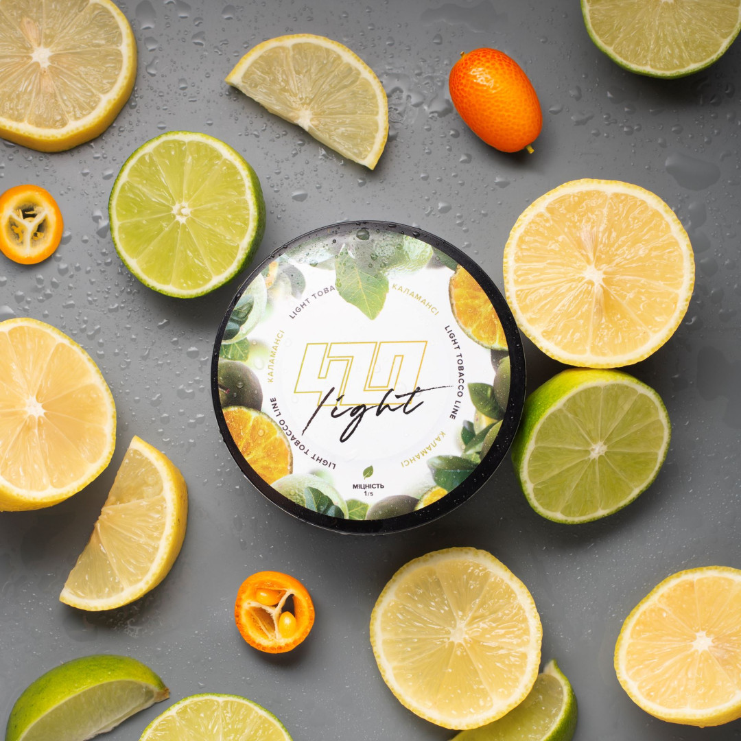Тютюн 420 light Каламансі 100 грамів - це вибуховий освіжаючий цитрусовий мікс, що перенесе вас у тропічний рай. В його основі лежить унікальний смак каламансі — екзотичного фрукта, який поєднує в собі яскраві ноти лайма, лимона та кумквату.