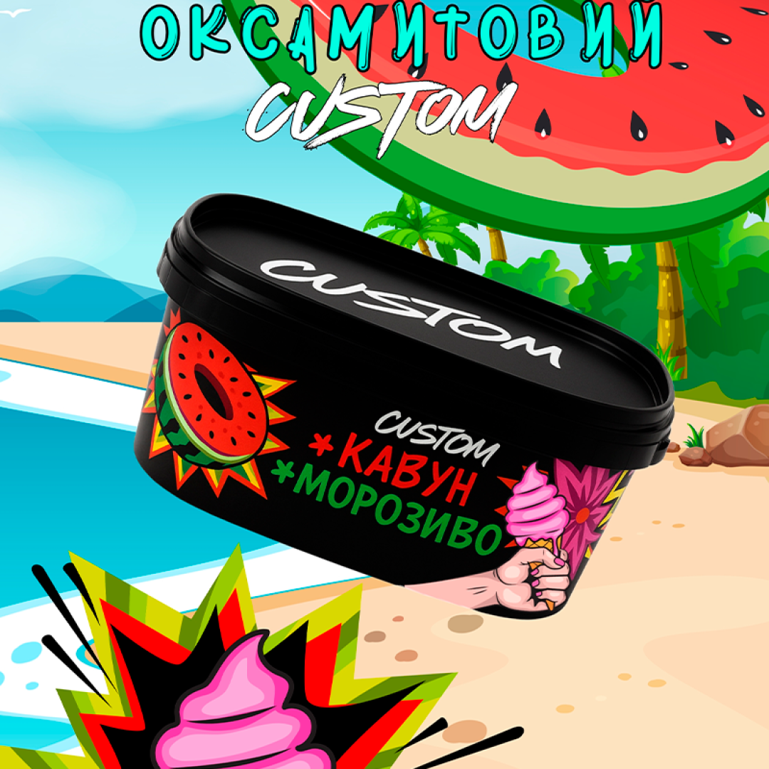 Тютюн Custom Кавун, Морозиво — це справжня холодна насолода, що перенесе вас у теплі вечори з морозивом біля моря. Цей смак поєднує в собі соковиту свіжість кавуна з ніжною, вершковою солодкістю морозива.